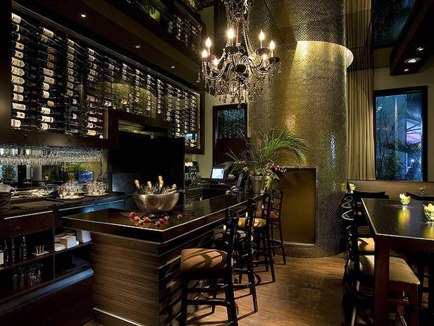 For the Barolo Ristorante in Miami, Fla., Diaz designs an unexpected wine bottle display for their wine tasting bar. Dark woods and low lighting give the space a cozy, inviting ambience, while a large column is covered in mosaic tiles for a touch of sparkle.